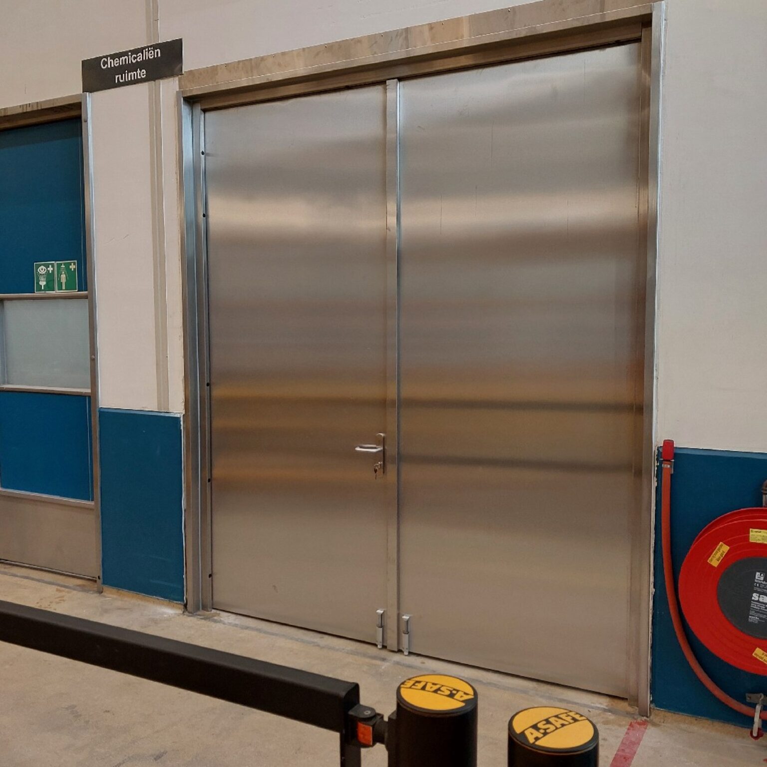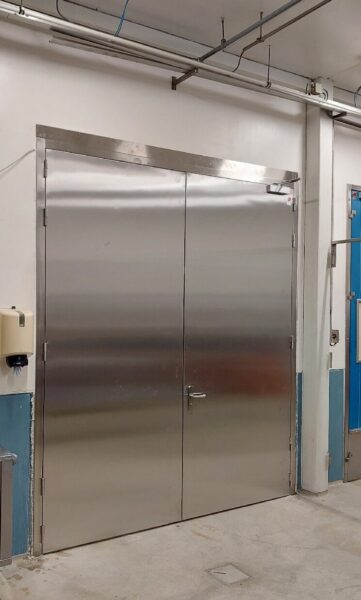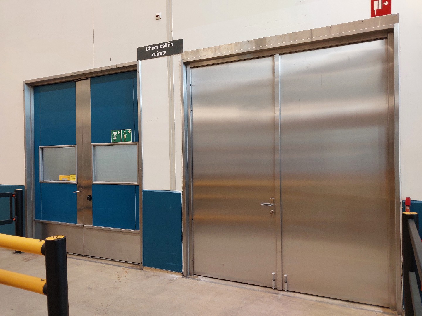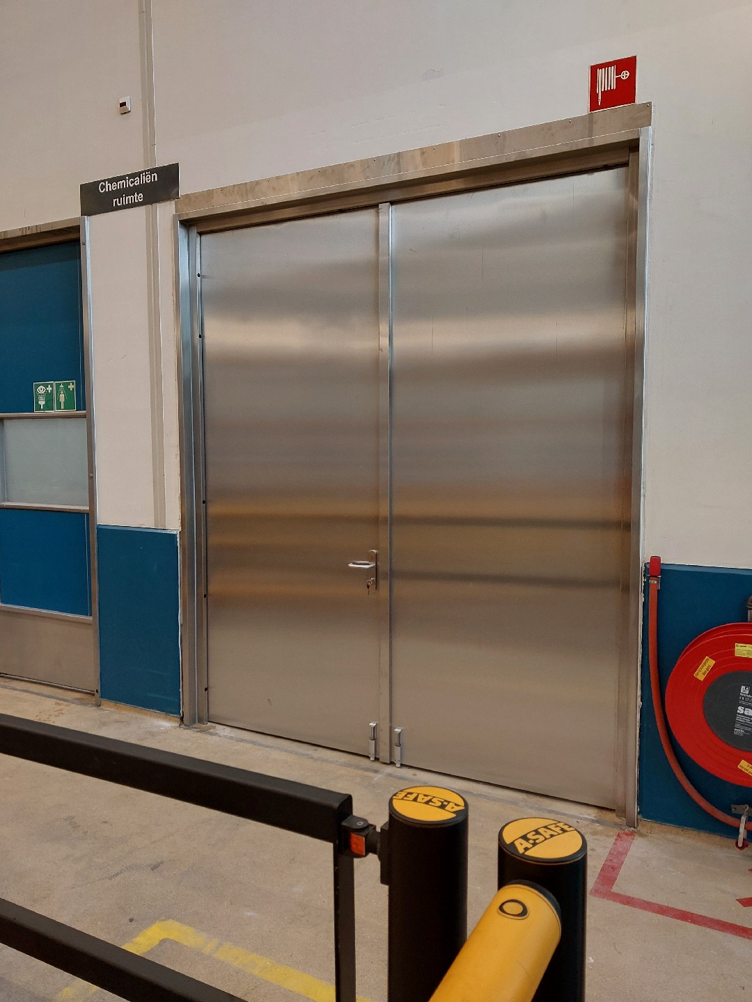 Onlangs hebben wij één van de toegangsdeuren vervangen door een RVS branddeur. Deze deur biedt niet alleen een 60 minuten lange bescherming tegen brand, maar is ook bestand tegen de aantasting door giftige stoffen. Het verschil tussen de oude en nieuwe deur is duidelijk zichtbaar, wat de verbeterde veiligheid en kwaliteit onderstreept.